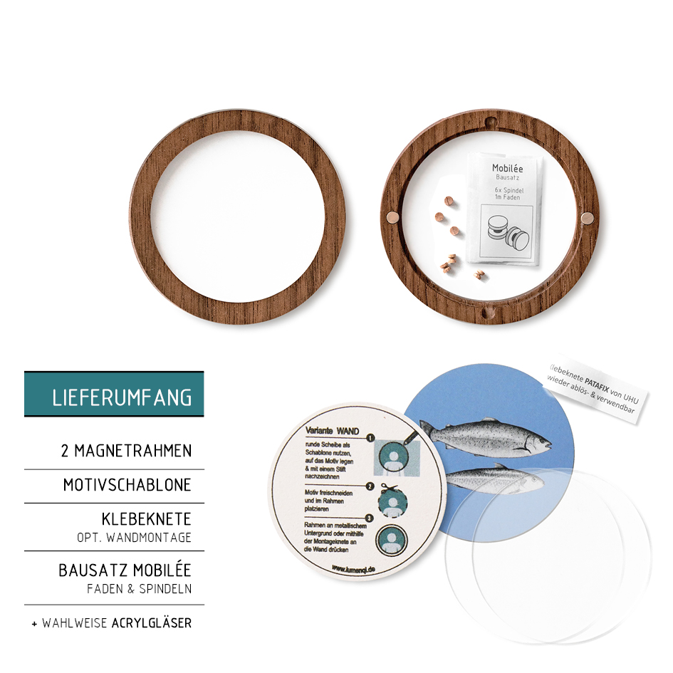 Das Beste: Der runde Bilderrahmen aus Holz kann überall angebracht werden. Zwei starke bündig eingelassene Neodym-Magneten auf der Rückseite ermöglichen eine einfache Anbringung auf metallischen Untergründen. Zudem findet ihr im Set auch Klebeknete für eine optionale flexible Wandmontag. Als dritte Option könnt ihr zwei Bilderrahmen zum einem Hängerahmen vereinen. Mithilfe kleiner mitgelieferter Spindeln könnt ihr eure Rahmen auch als Hängevariante nutzen.