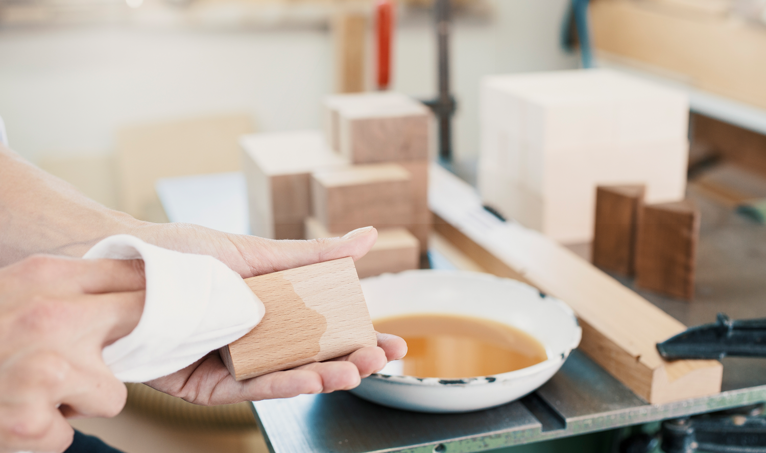 Unsere Produkte werden sorgfältig geschliffen und geölt. Die Farbnuancen der Hölzer kommen dadurch noch besser zur Geltung. Für diesen Zweck nutzen wir seidenmattes Hartwachsöl. Die einzigartige Öl-Wachs-Kombination ermöglicht eine Schmutzunempfindlichkeit, Abriebs- und Wasserfeste.  Zudem ist es ebenso geeignet für Kinderspielzeuge.
