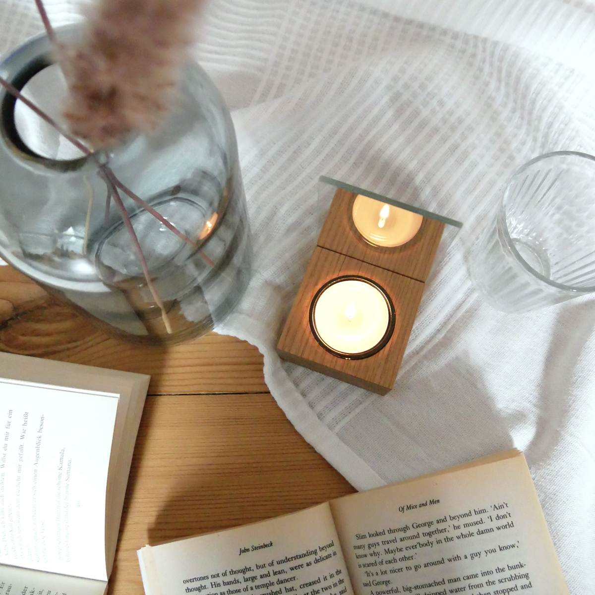 Eine lange Lebensdauer gewährleisten wir euch natürlich auch. Unsere Hölzer sind nebst des Öls auch mit Hartwachsanteil versiegelt worden. So perlen selbst kleine KaffeeFauxpas’ problemlos an den Lichtern ab. Wir wünschen euch viele hyggelige Stunden mit dem Lichterzauber.