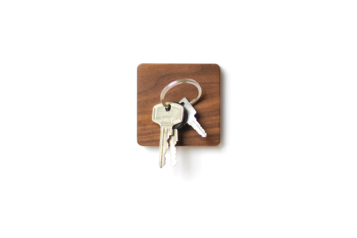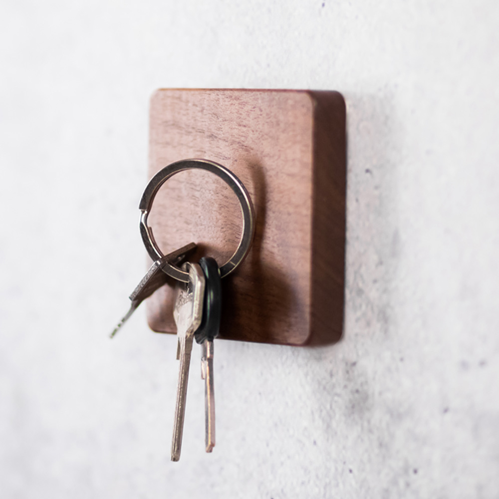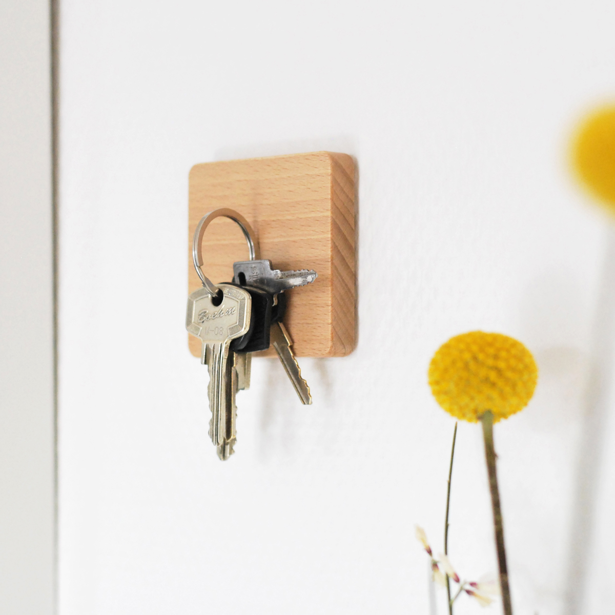 Ich würde empfehlen, einen Schlüsselring zu benutzen, der magnetisch hält. Ersten bekommt man dann leichter mehrere Schlüssel an das Quadrat und zweitens entstehen nicht so schnell Kratzer auf dem Holz.