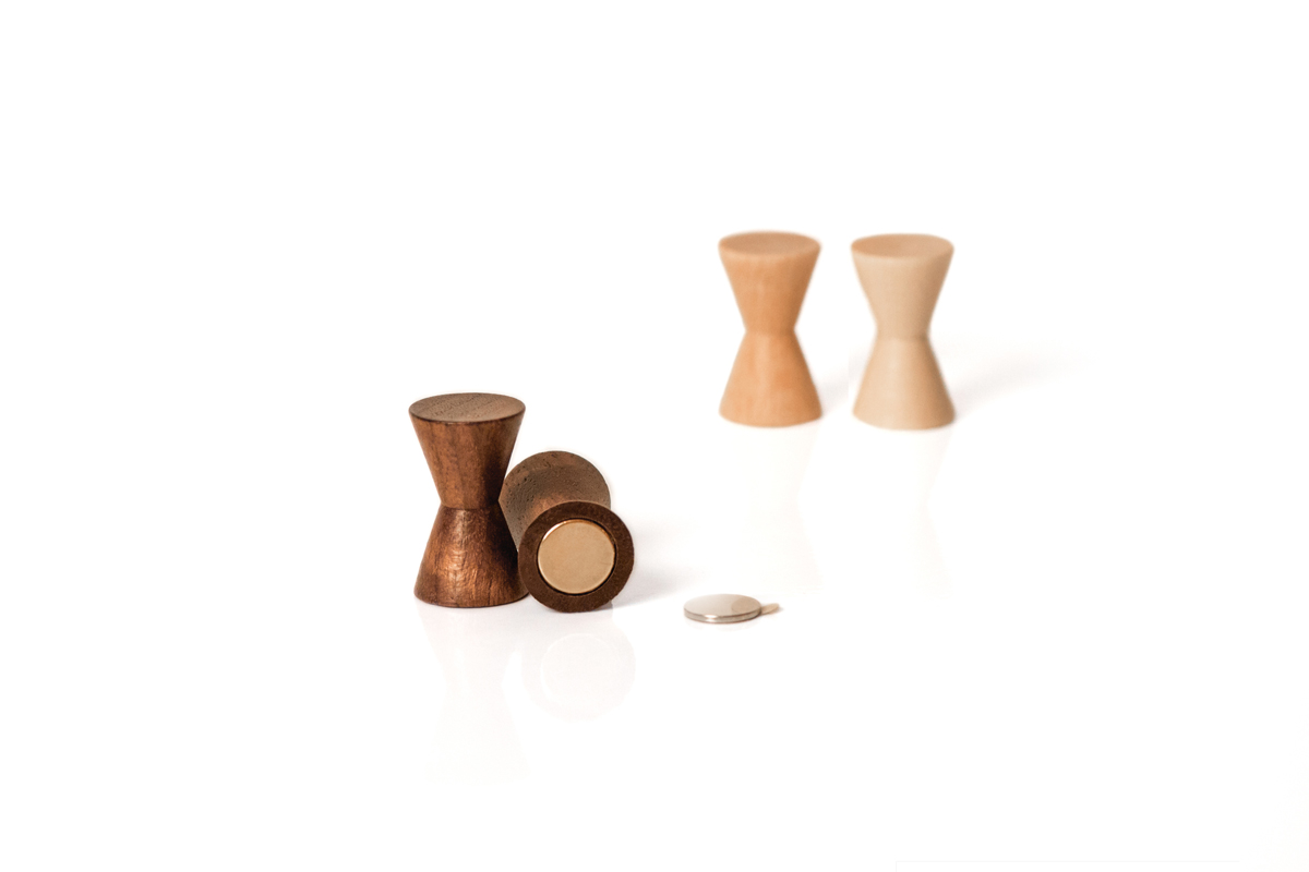 In unsere Holzpins haben wir bündig starke Neodym-Magneten verklebt. Die wohlproportionierte Doppelkegelform ermöglicht eine Aufhängung von beispielsweise Ketten, Ringen, Ohrringen etc.